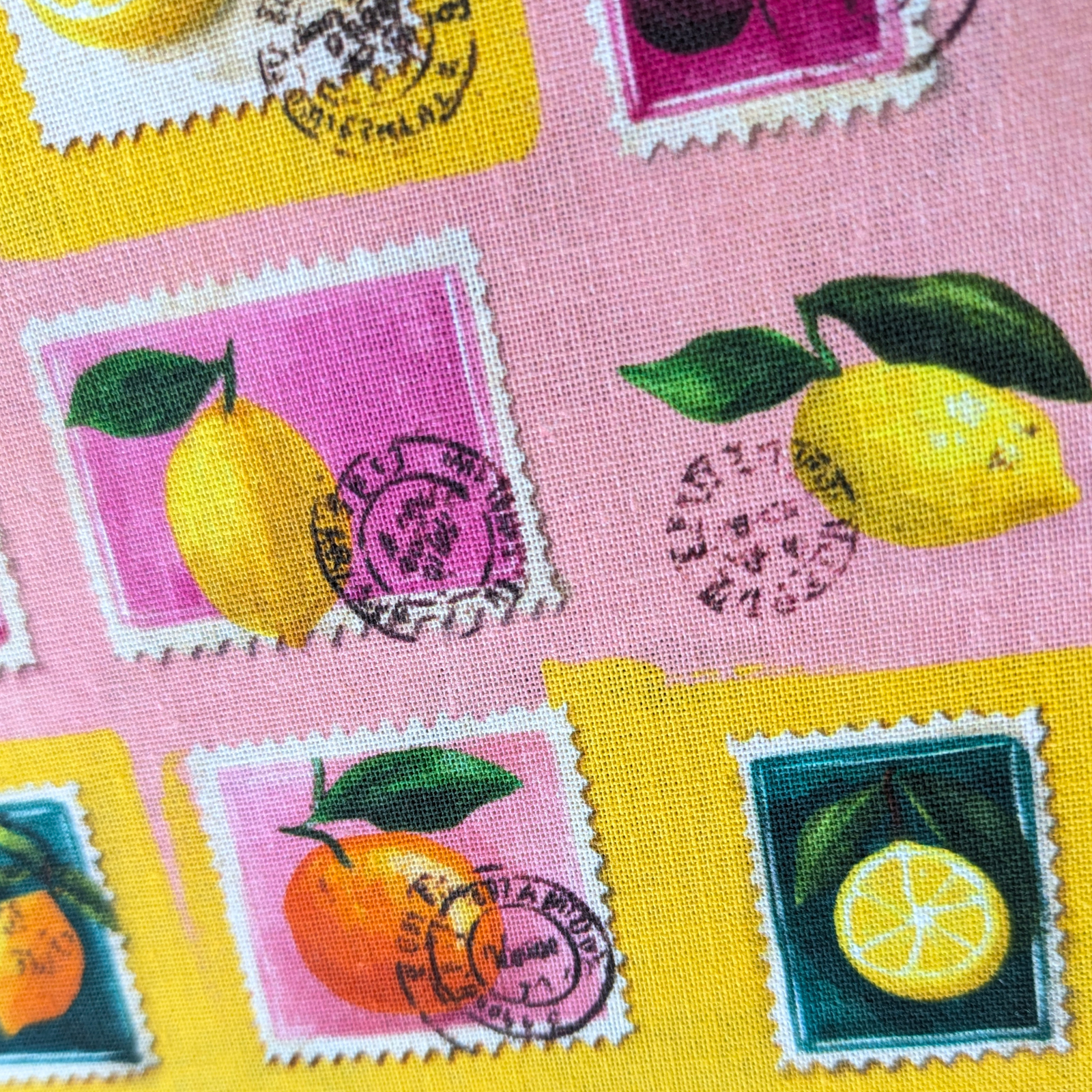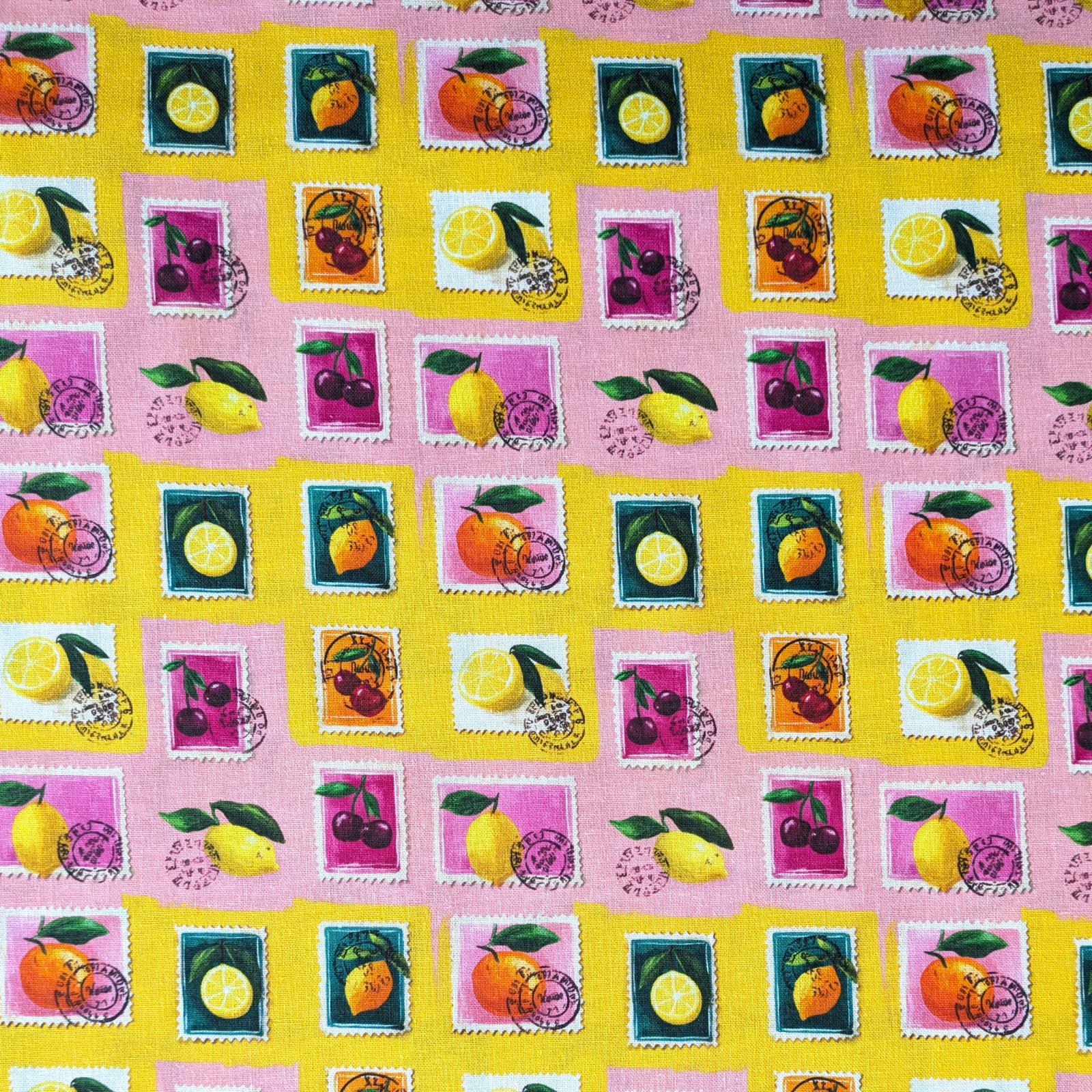 Fruit Stamps Digital Print Digital Print Cotton Fabric. Bright and fresh digital print in stamp design on a yellow and pink ground. Good quality cotton suitable for dress and shirt making. Crafting and patchwork