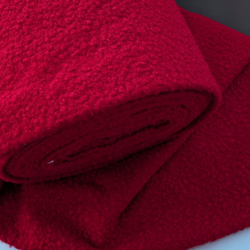 Polyester Boucle Fabric Red 150cm Wide. A good quality coating fabric with a soft handfeel. 100% Polyester snuggly boucle fabric. Lovely texture with a textured, curled finish. Great for coats wraps cardigans etc. Washable at 30 degrees. Cool iron. Do not tumble dry.
