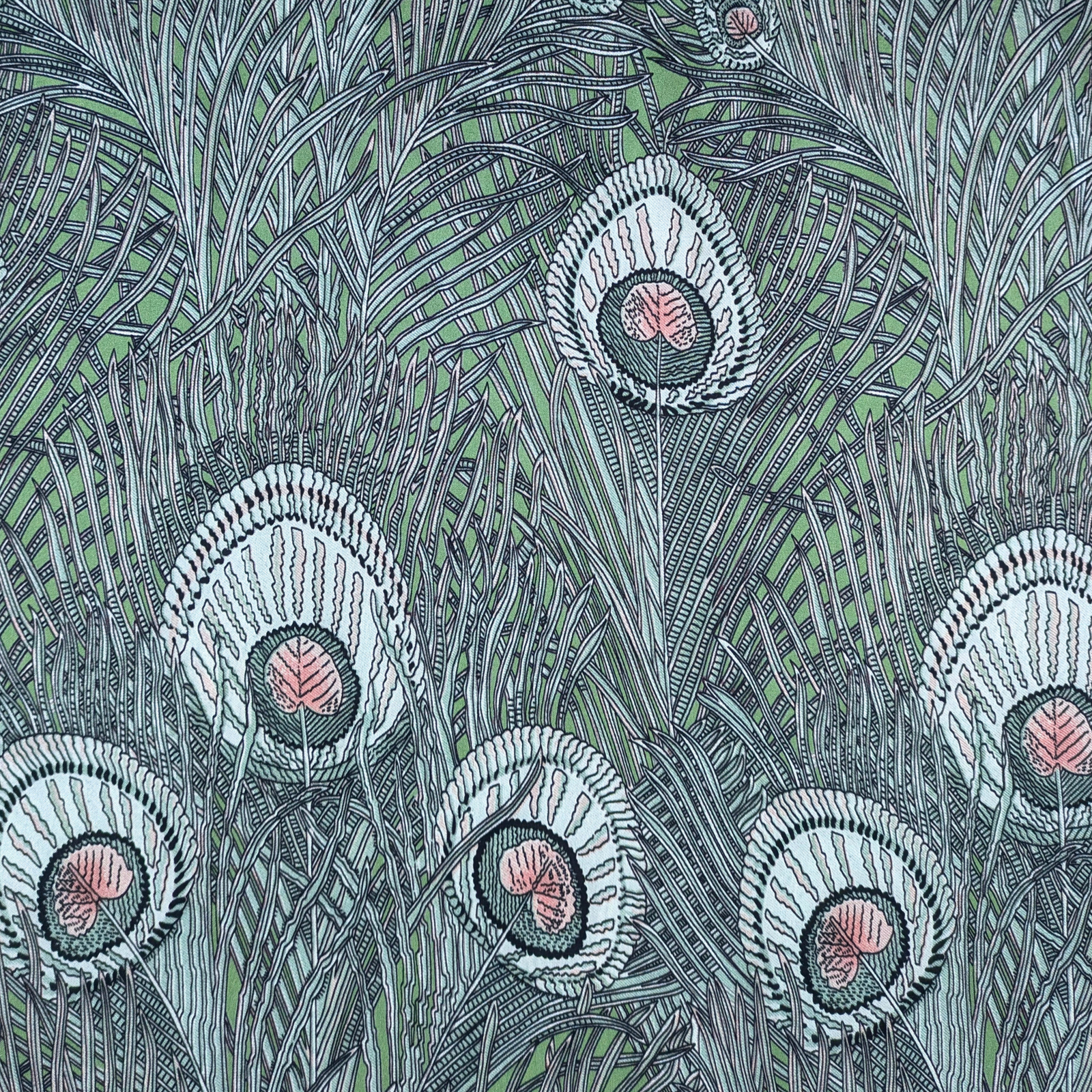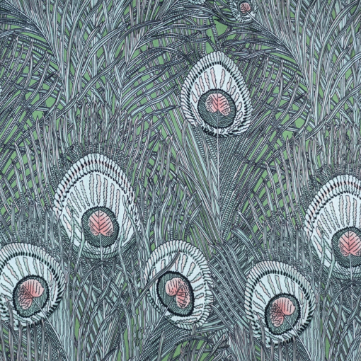Silk Satin 16 Momne Peacock Feathers On Green 140cm Wide