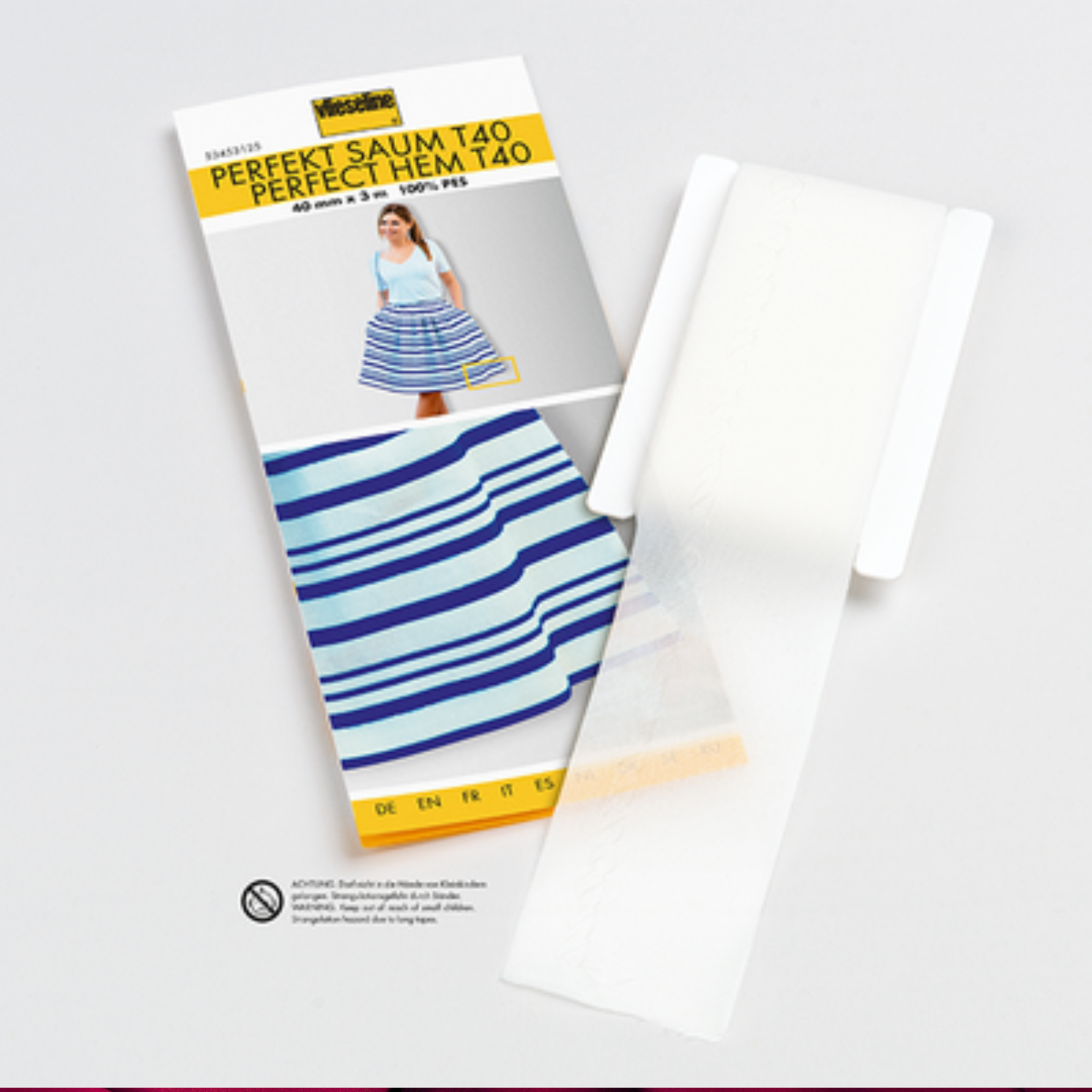 No-sew Hem! From Vilene, consists of 2 woven bands, one above the other – in each case with the adhesive interfacing out – which are joined together using a blind stitch. Ideal for soft hems, e.g. of blouses, dresses, skirts, trousers, jackets, and coats.