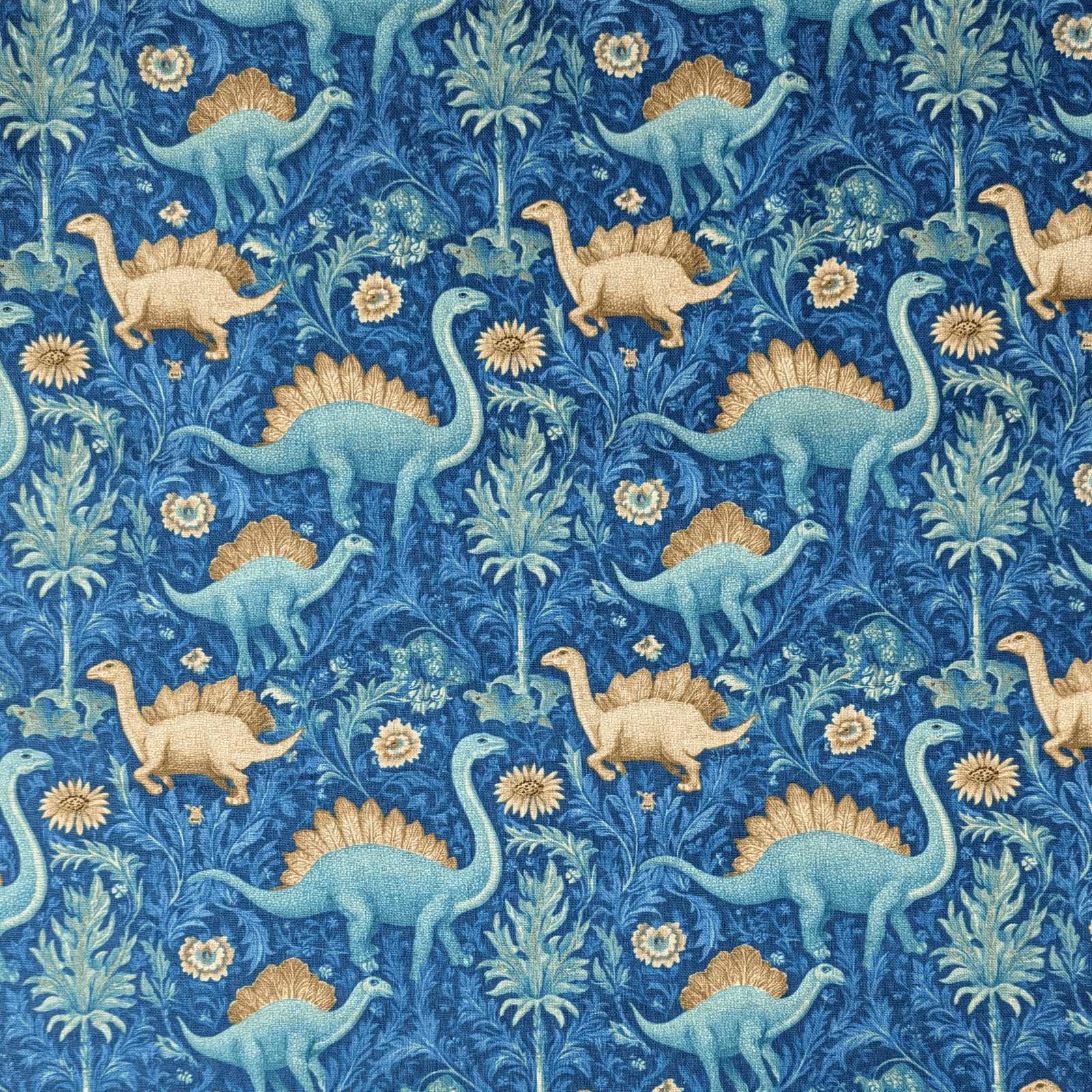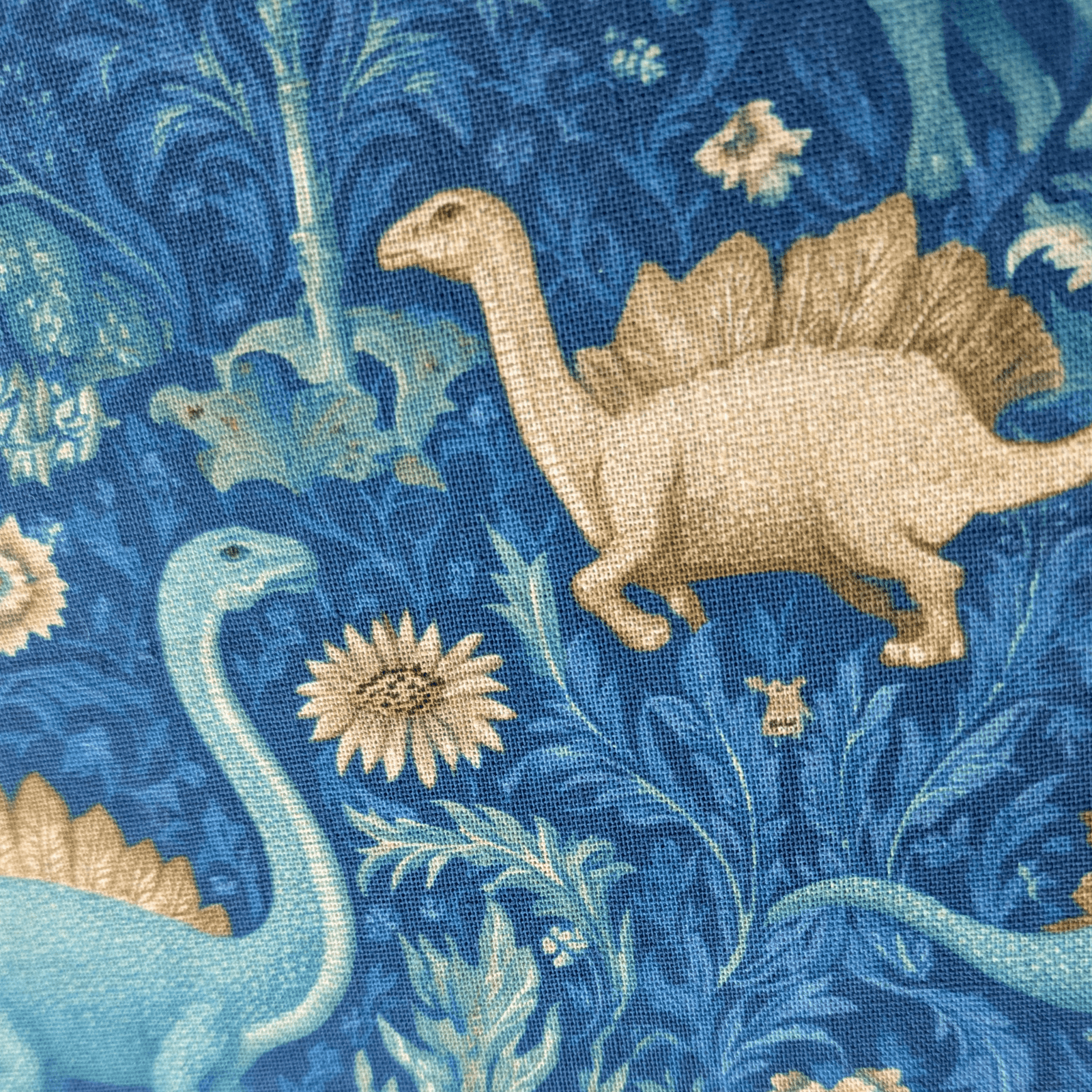 William Morris Dinosaurs Digital Print Cotton Fabric. We love a William Morris style print and this mash up with dinosaurs really makes us smile! Good quality cotton suitable for clothing, patchwork and crafting. Teals and blues.
